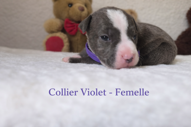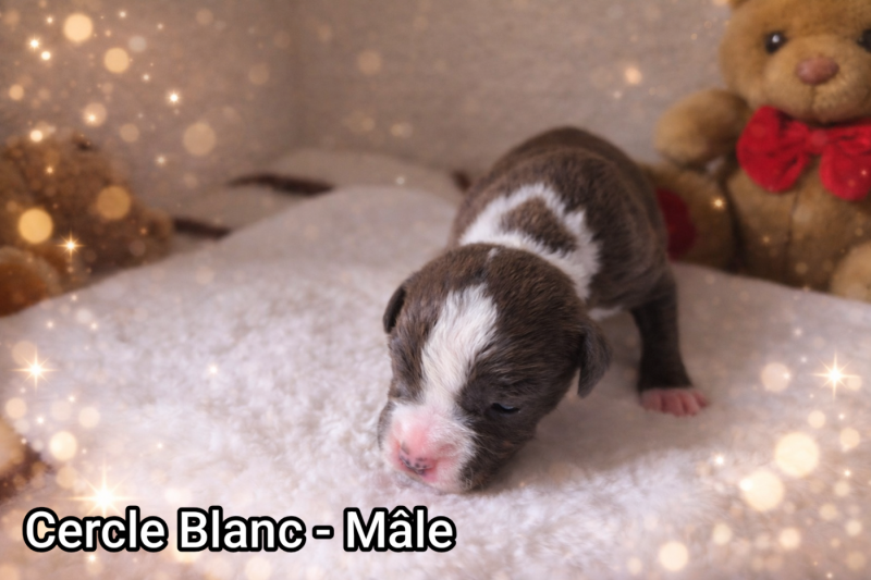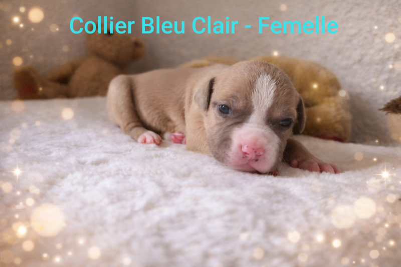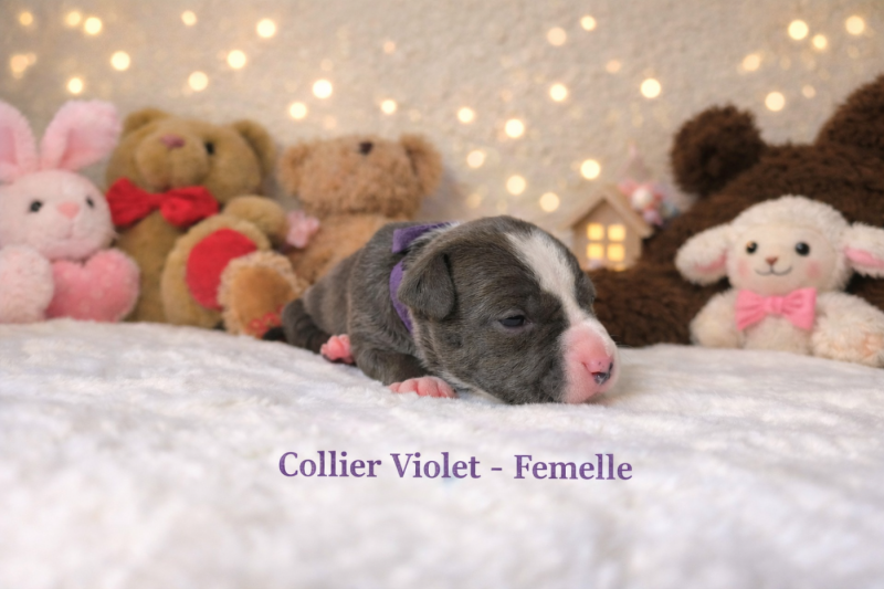 Nezuko est une femelle possédant une belle ossature et une très jolie tête, typique de la race. C’est une chienne douce, proche de l’humain et très attentive à ses chiots. Son tempérament stable et affectueux reflète parfaitement ce que doit être un American Staffordshire Terrier bien équilibré.