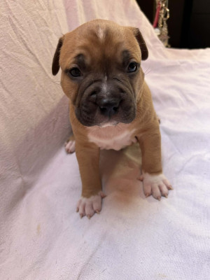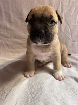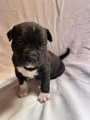 4 adorables chiots American Staffordshire Terrier inscrits au LOF, nés le 25 mars 2026 du mariage sélectionné entre Orus et Teïka (visibles sur la première photo).