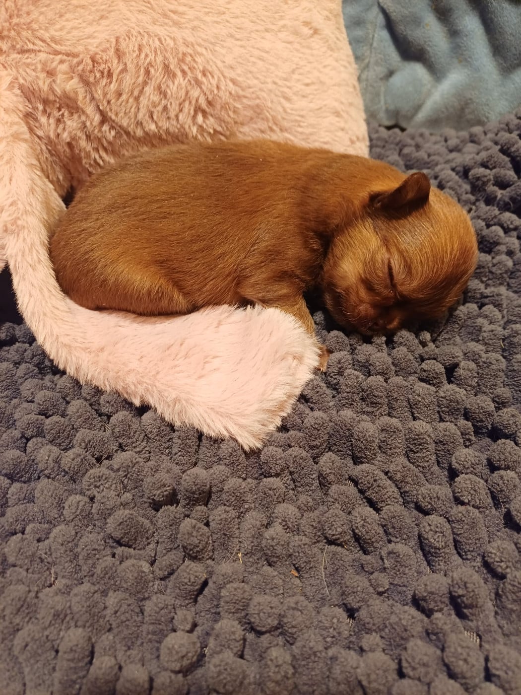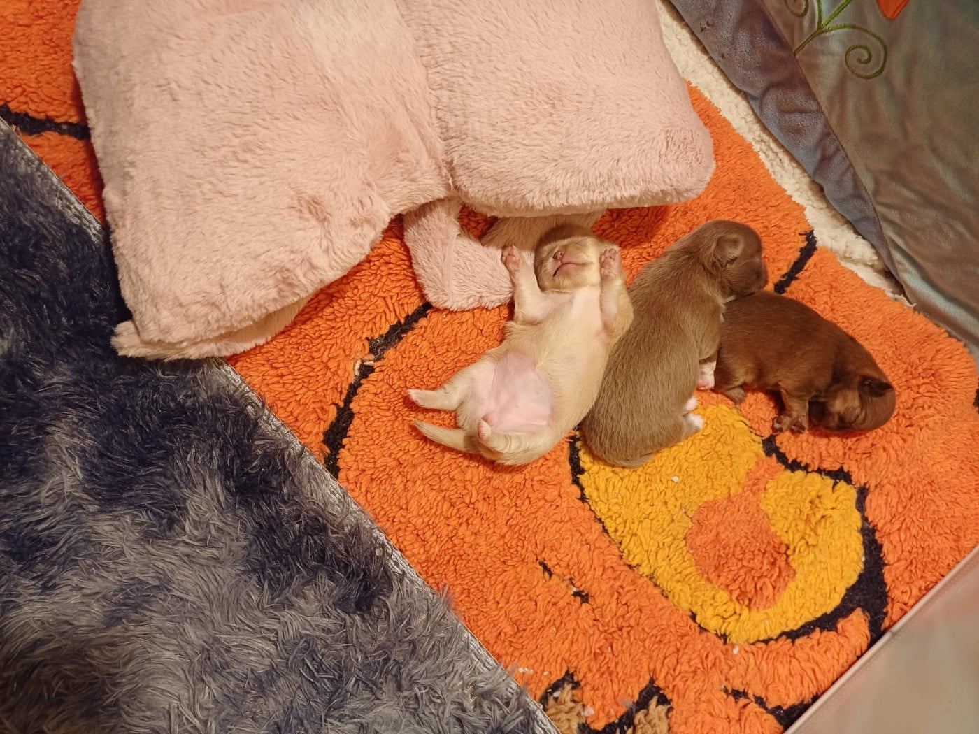 3 magnifiques petits bouts poil long sont nés d'un superbe mariage tant attendu entre Vaïana et Teddy, une femelle beige, une femelle lavande avec liste blanche et un tout petit mâle chocolat ! 3 petits chihuahuas avec un type bien défini qui reste dans le standard ( bien pommés , nez courts)