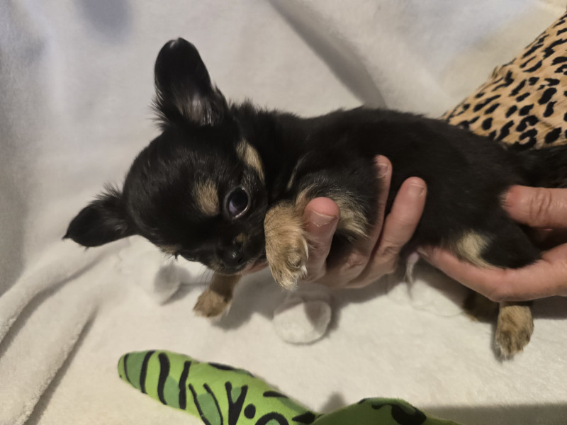 3 adorables chiots chihuahua à poil long, élevés en famille, habitués aux bruits du quotidien et très câlins sont disponibles à la réservation.