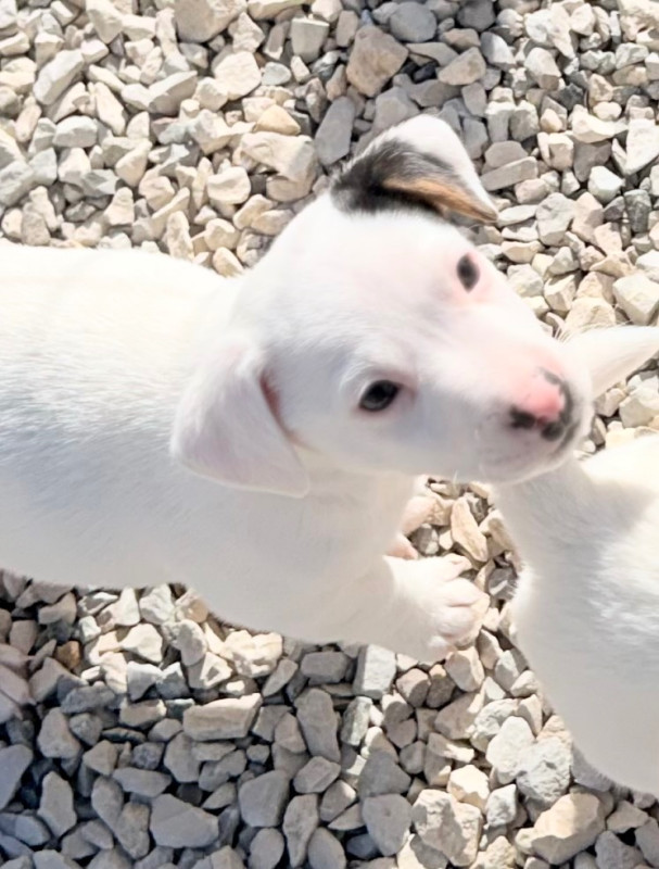 Tout blanc avec une tache côté gauche au niveau de l’oreille.