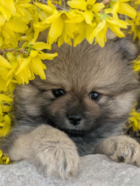 Ursula la maman est une spitz moyen sable charbonnée et Yoshi le papa est un spitz petit merle chocolat. Les parents sont inscrits sur le registre des origines cynophile de l'alliance française canine (AFC), ils sont testés "Embark" race et maladie génétique. Les chiots seront "non lof" mais auront un "pedigree AFC" comme les parents.