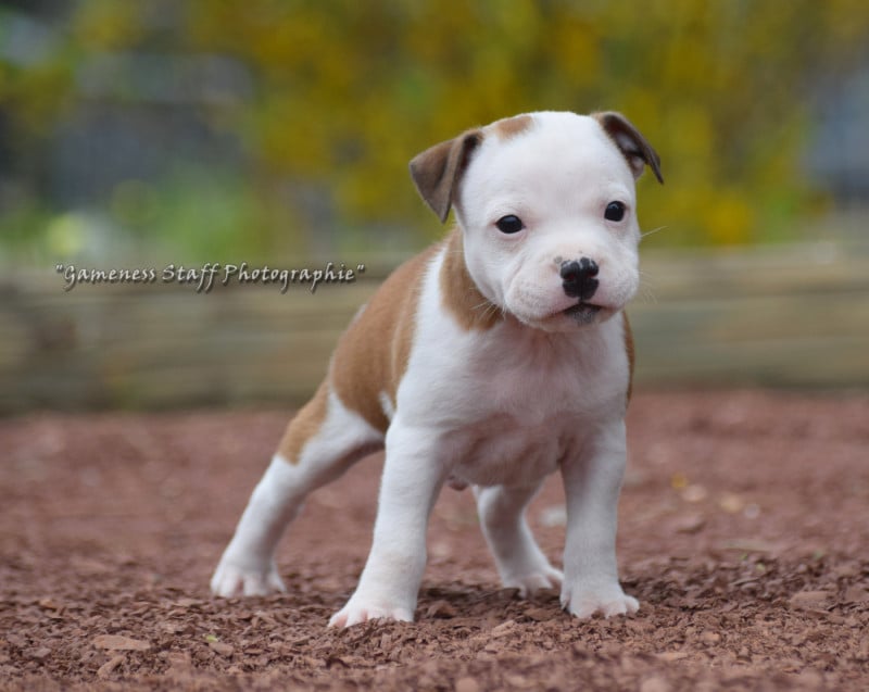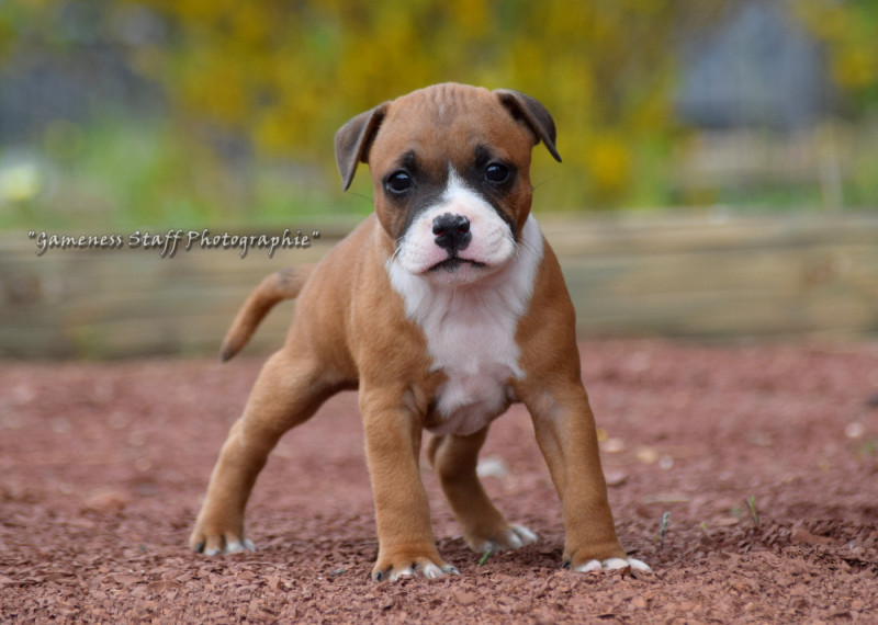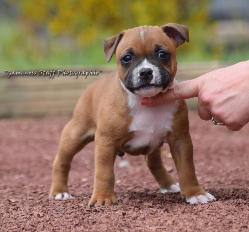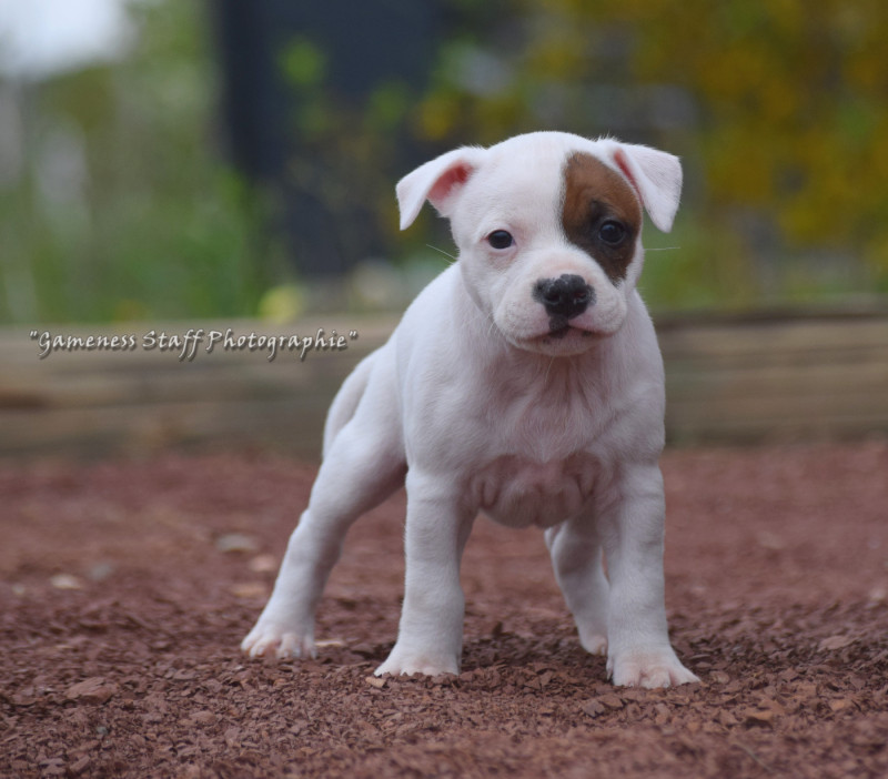 Nous sommes heureux de présenter cette nouvelle portée née à l élevage Gameness Staff. Cette portée est le fruit d un mariage longuement réfléchi entre deux chiens sélectionnés pour leur construction, leur tempérament et la qualité de leurs lignées. Notre objectif est de produire des Staffordshire Bull Terriers équilibrés, solides et polyvalents, capables d être aussi bien d excellents compagnons de famille que des chiens actifs pouvant pratiquer différentes activités sportives. Les deux parents possèdent des caractères stables et proches de l humain, avec l énergie et la détermination qui caractérisent la race. Comme toujours à l élevage, une attention particulière est portée à la socialisation précoce des chiots, afin de favoriser des chiens confiants et bien dans leurs pattes.