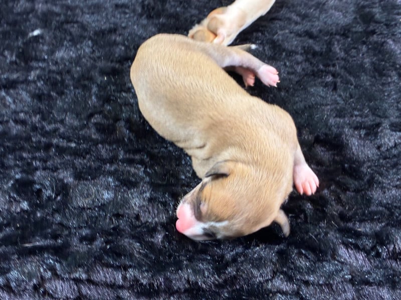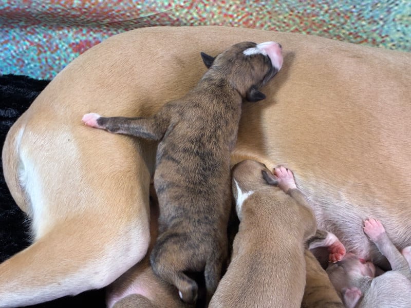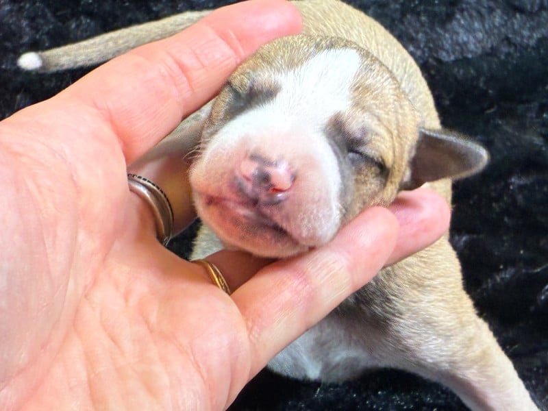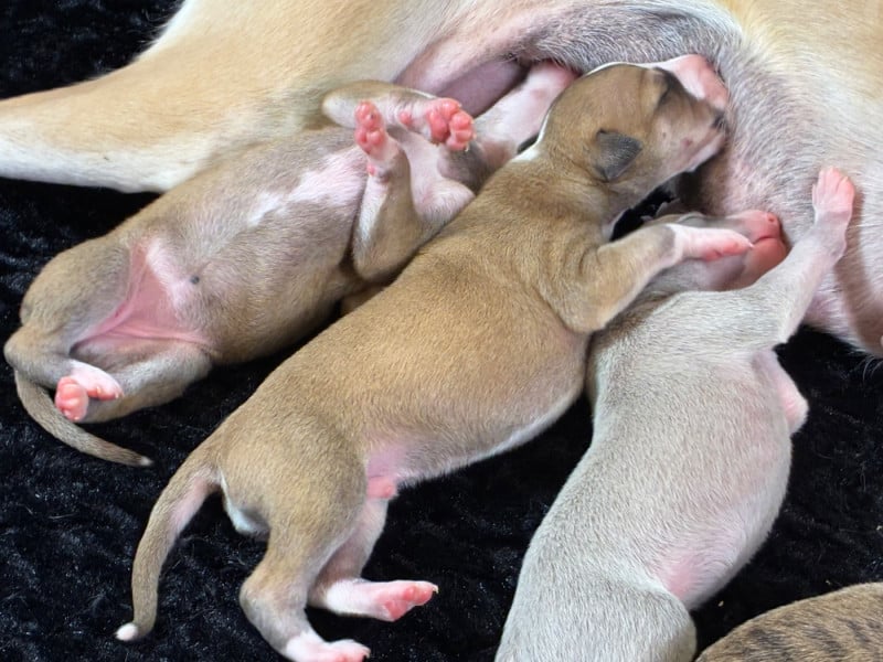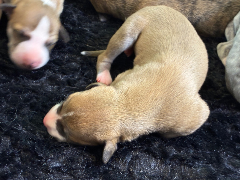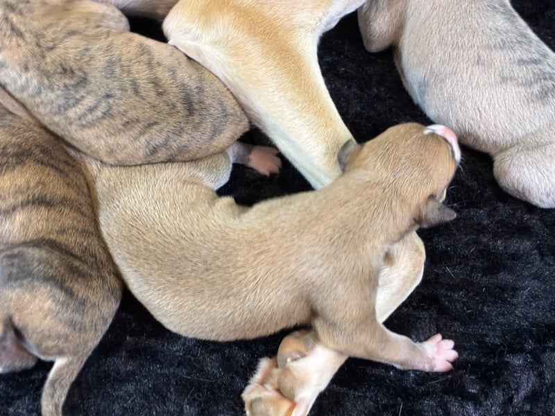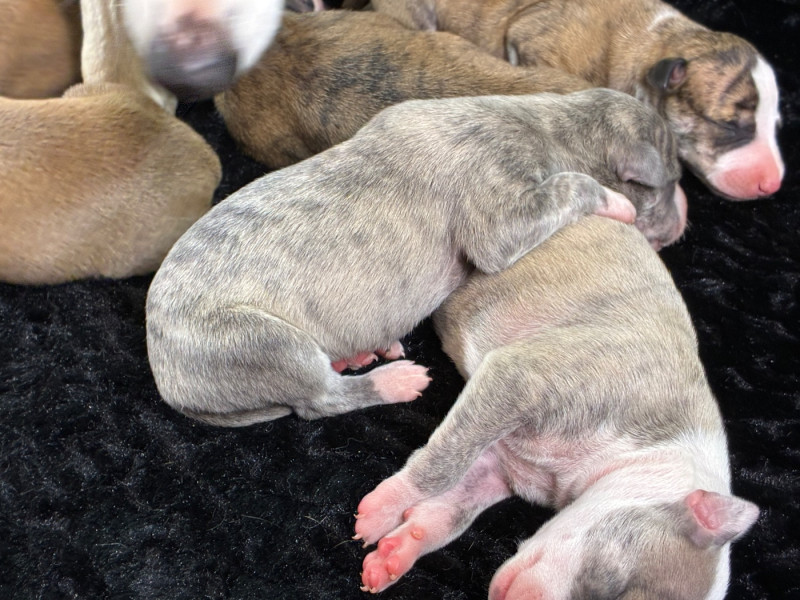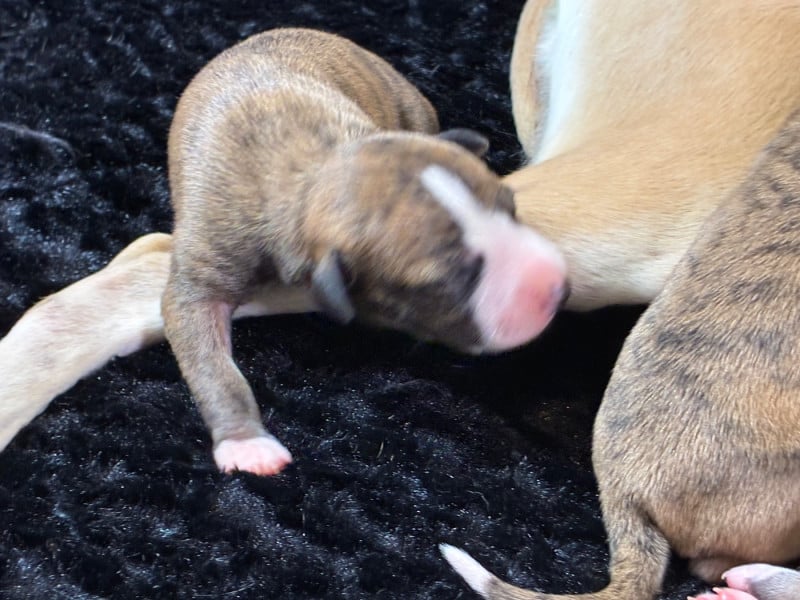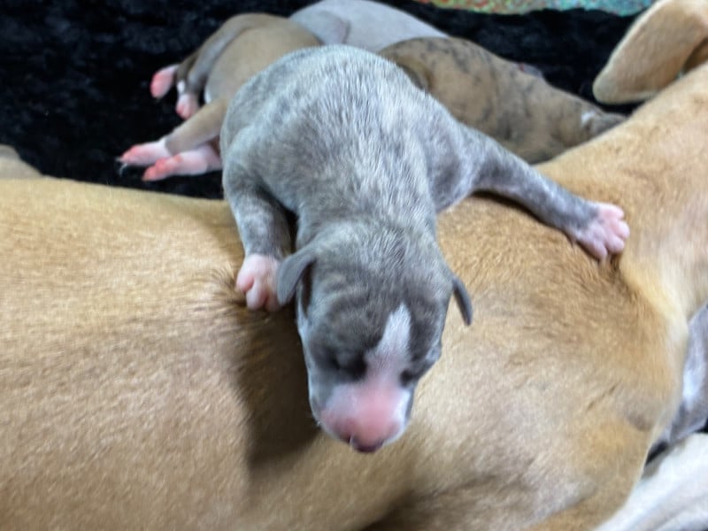 Sublime portée très prometteuse avec une maman au top et de toute beauté et un papa exceptionnel. Pour lui c'est sa 2ème portée et je suis conquise par celle-ci qui promet de beaux chiots, vraiment bien conformés et avec un caractère en or au vu des parents. Les couleurs sont superbes et assez inattendues : d'avoir du bringé noir et du bringé bleu dans la même portée c'est pas très courant ! Guinnes tient toutes se promesses : je suis ravie de l'avoir importé de Hongrie l'année dernière ! Pour le coup j'envisage de garder 2 chiennes de cette portée.