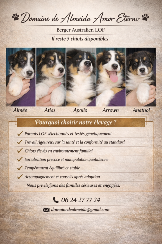 Notre élevage familial et rigoureux propose actuellement 5 chiots Berger Australien LOF :