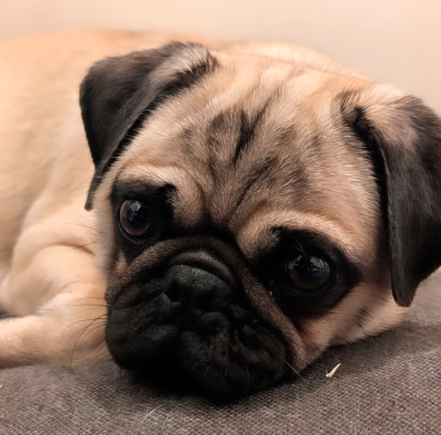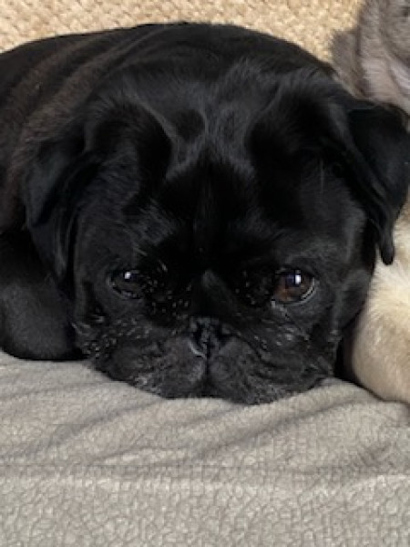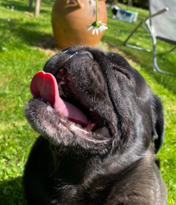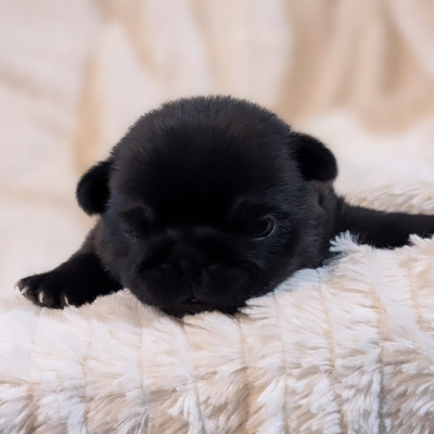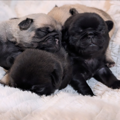 Sur une portée de 4 chiots carlins nés le 02/02/2026. 1 mâle noir est encore disponible à la réservation.
